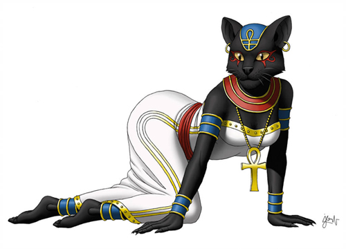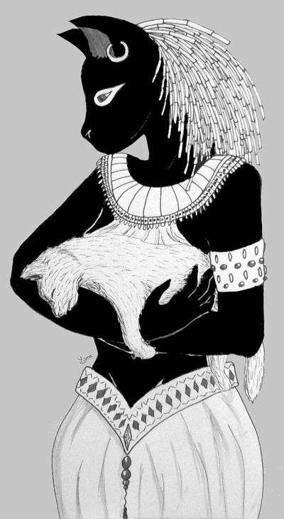 This art featuring Bastet was done by Yliade @ dA. For full version, look here. The artist has done many other egyptian gids drawings, check them out!